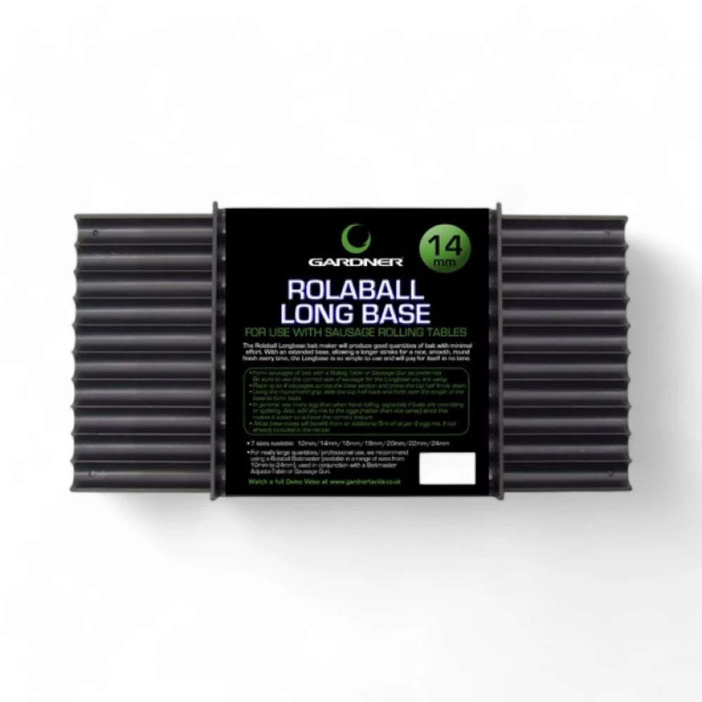 A Rolaball Longbase egy standard mérettel rendelkező rendkívül erős és masszív bojli roller, amellyel a kinyomópisztoly segítségével elkészített hurkákból szabályos golyó formájú bojlik készíthetők. Az igényes kialakítású praktikus segédeszköz a legkiválóbb minőségű és strapabíró A.B.S. anyagból készül ( autóiparban használt műanyag) így tartós használat során sem fog tönkremenni. A Rolaball Longbase-t már évek óta töretlen népszerűséggel bír, a szigetországban pedig teljes megelégedéssel és bizalommal használják. Bizonyítottan a legjobb roller a jelenleg kapható mai piacon. Méretéből adódóan kiválóan alkalmas külön csalizó illetve lebegő bojlik készítésére, mivel egy sodrással 10 db bojli készíthető el. Hihetetlenül széles átmérő választékban kerül forgalomba. 30cm hosszúságához 15cm szélesség párosul. Kiváló ár és érték aránnyal bír. Eredeti hamisíthatatlan angol gyártás!