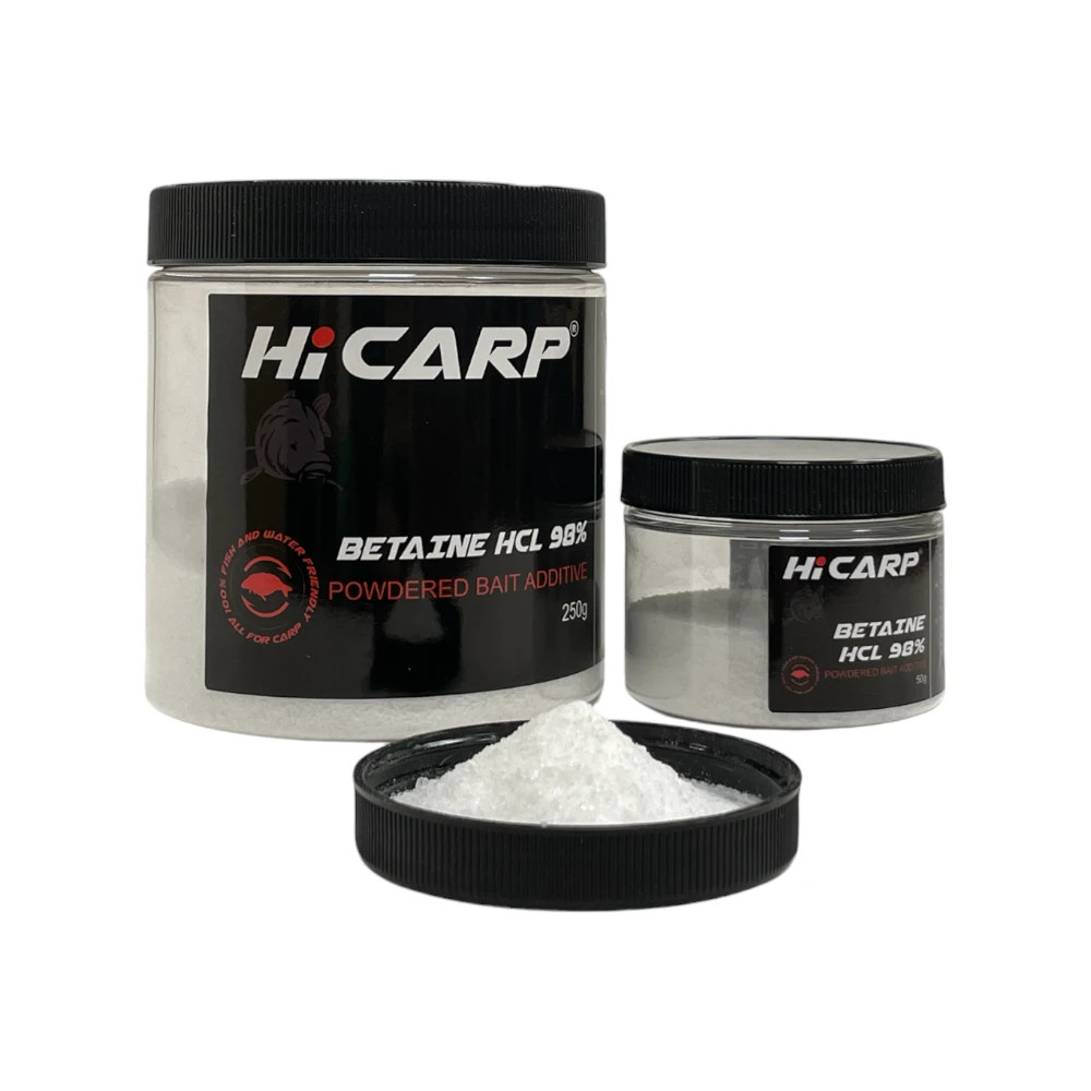 A Betain HCL 98% (Trimetil-glicin-hidroklorid) valószínűleg a legismertebb attraktor és táplálkozást serkentő  anyag a pontyhorgászatban. Ez a ma elérhető legtisztább betain por, több mint 98%-os tisztaságú finomított betaint tartalmaz. A fehér, kristályos, szagtalan, enyhén savanyú port kémiai úton a cukorrépából vonják ki. Vízoldékonysága 100%! A betaint már évek óta használják, elsősorban állati takarmányokban, tápokban, de néhány élelmiszeripari termékben is jelen van. Csalogatóhatásán kívül az élettani hatásai sem elhanyagolhatóak, mivel javítja az anyagcsere működését, segíti az immunrendszer működését, védi a bélrendszer hámsejtjeit és stressz csökkentő hatása is van. A ponty csalikban az egyik legnépszerűbb és a legrégebb óta használt kristályos, por alapú attraktor. Nem kérdéses, hogy minden csalinak, legyen az etetőanyag, bojli, magok, stick és spod mix hihetetlenül megnöveli a vonzerejét. A rendkívüli hatékonyságát azonban legjobban a bojli mixekben fejti ki.